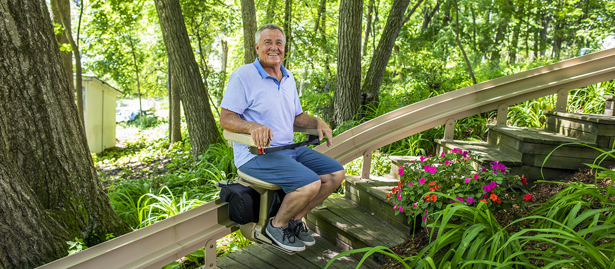 Count on Bruno’s Elite, the top-selling curved outdoor stair lift in North America. With its handcrafted rail, Bruno’s Elite curved outdoor stair lift precisely matches the elevation and angles of your staircase. Relax outdoors with an easy-to-use Elite built specifically for your home, ready to handle any weather conditions. |